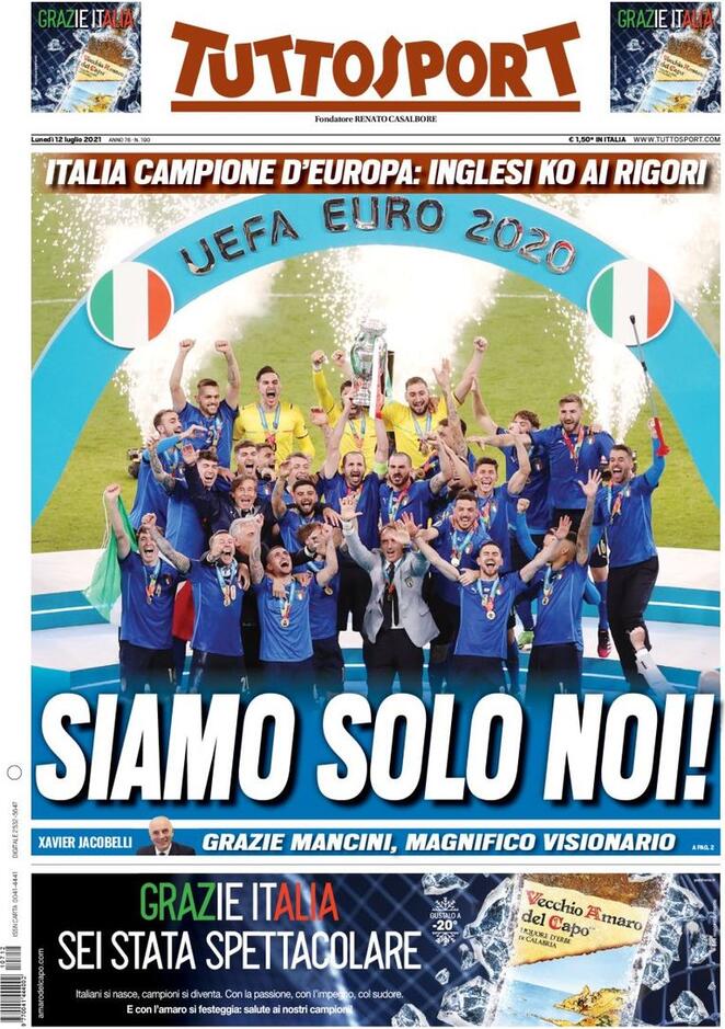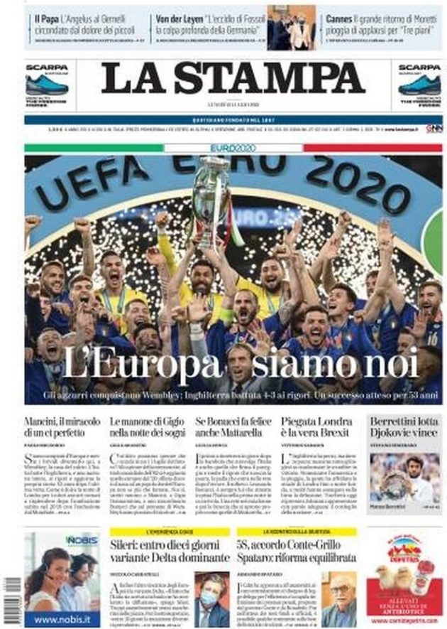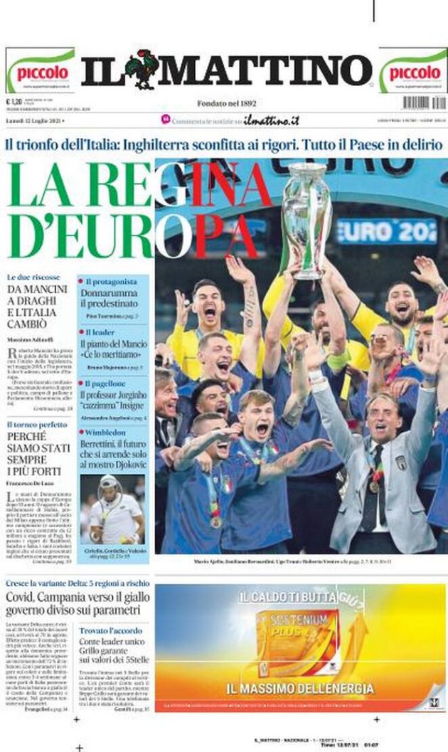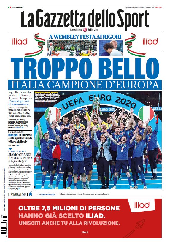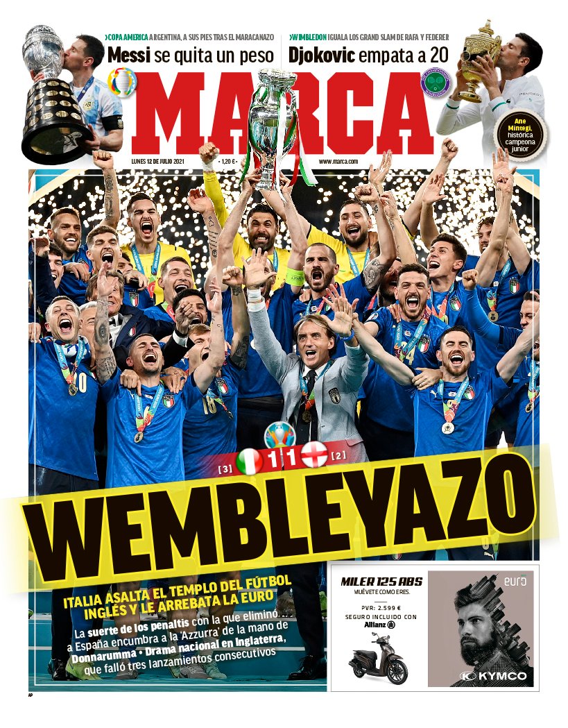 Tony Cittadino (Mallorca).- La segunda Eurocopa en la historia de Italia fue reseñada en primera plana en los diarios más importantes del mundo. La Azzurra sumó su segundo trofeo a las vitrinas, luego del obtenido en 1968, tras imponerse a Inglaterra en los penales (3-2). Ambas selecciones empataron a un gol en 120 minutos, en final disputada en el mítico estadio de Wembley.