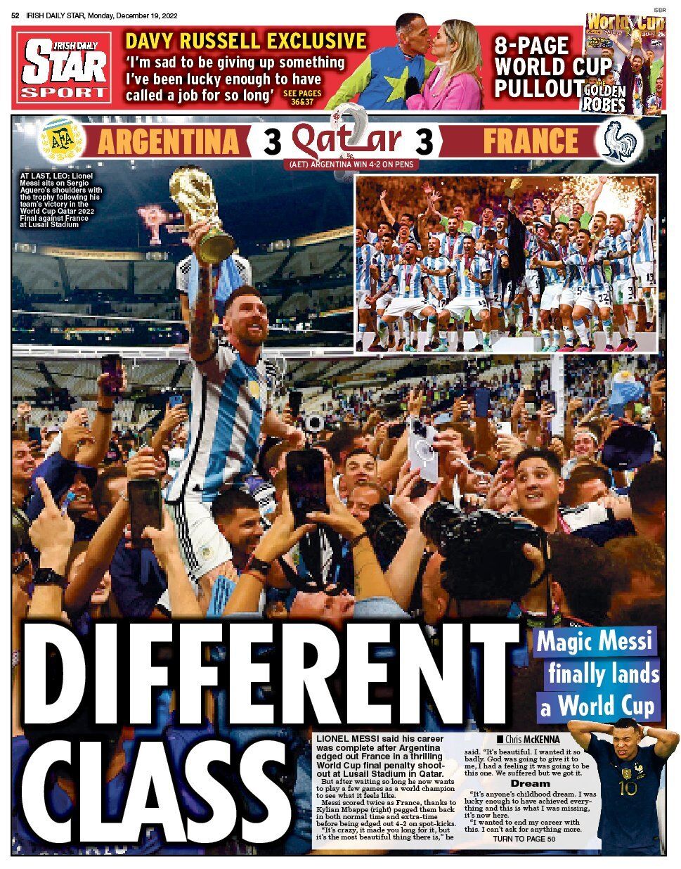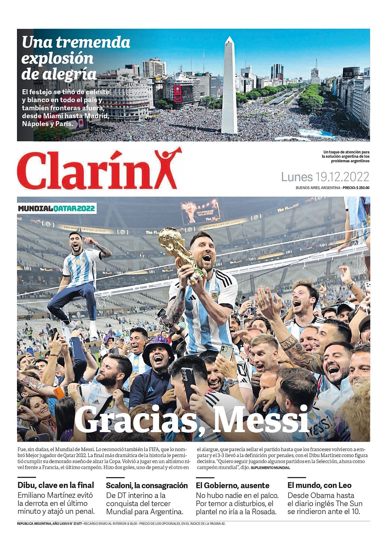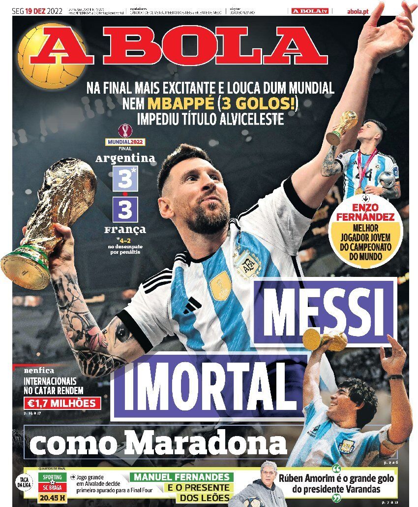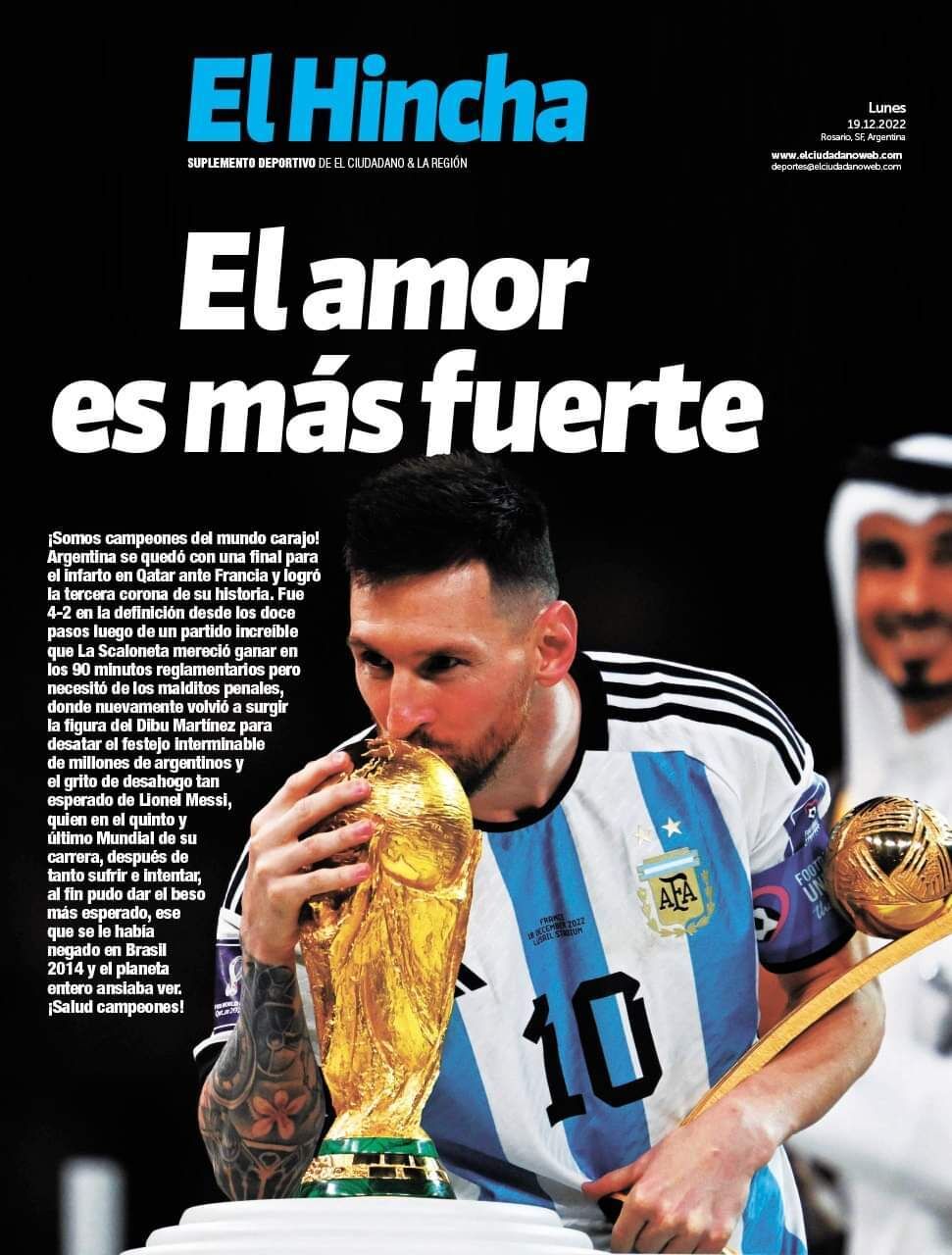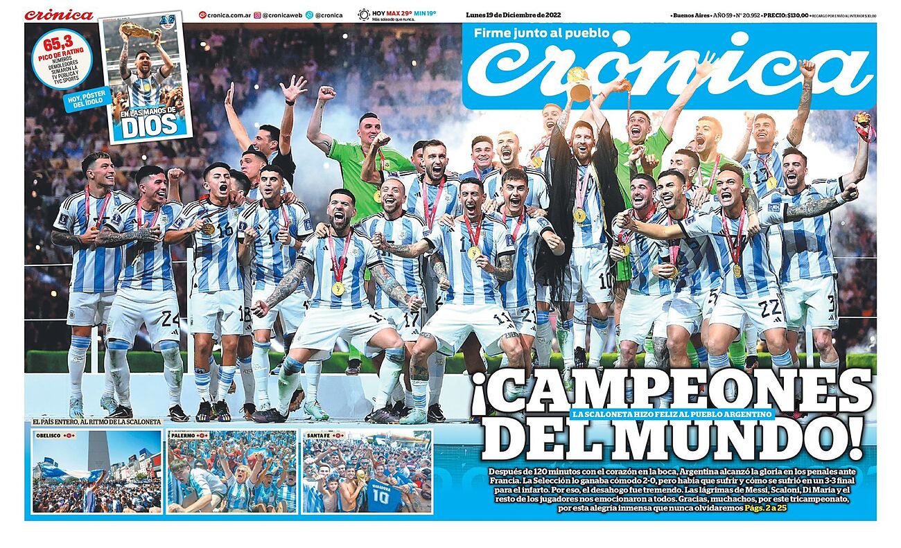 El sueño se cumplió. Argentina venció a Francia en penales, tras empatar a tres goles en 120 minutos en el Luisail Stadium, para consagrarse tricampeón del mundo tras los éxitos logrados en 1978 y 1986. Los goles de la Albiceleste fueron de Lionel Messi, que finalmente levantó la Copa, gracias a un doblete y a otro tanto de Ángel Di María.