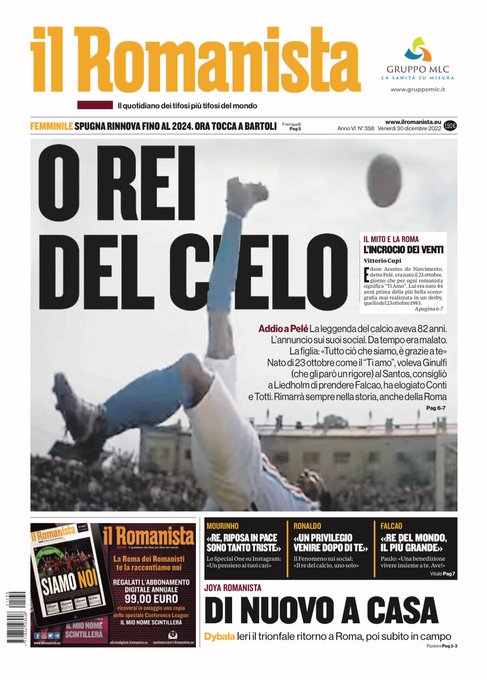 Federación Italiana de Fútbol (FIGC): “Es un dolor enorme. Hoy el fútbol llora a un grandísimo, porque Pelé era el fútbol. Gracias a él, fue el juego más amado y practicado en todo el mundo. Su clase iluminará por siempre nuestros ojos”.