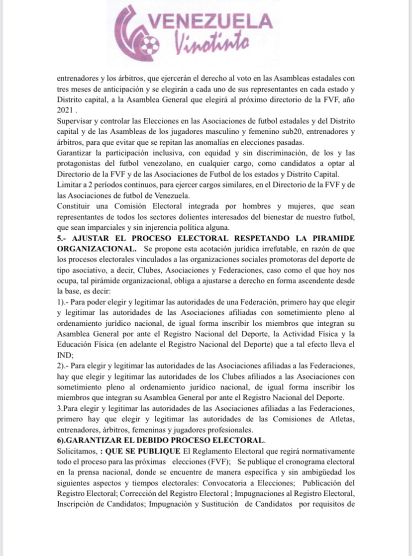 El ex director técnico de la selección nacional explicó una exposición de motivos y objetivos a cumplir, “para garantizar en el año 2021 unos comicios electorales federativos y en las asociaciones de fútbol de los 23 estados y Distrito Capital que sean limpios, justos, transparentes, con equidad, sin discriminación y ajustándose a las modificaciones reglamentarias electorales que la propia FIFA ha solicitado, a cada confederación y respectivas federaciones del fútbol universal”.