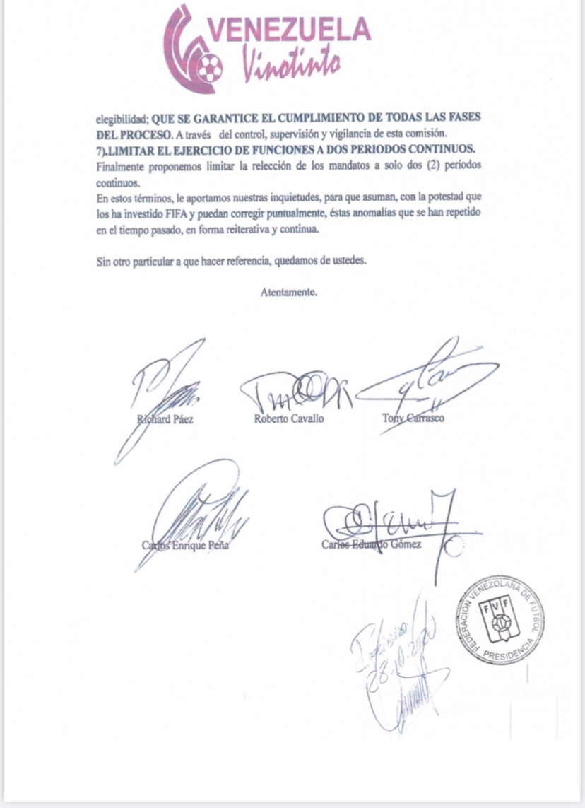 «Creemos que debería limitarse en dos periodos continuos para ejercer cartos similares en el directorio de la federación y de cualquiera de los cargos de las asociaciones de fútbol de venezuela. Con estyo queremos que la federación consiga el rumbo adecuado» cerró Páez.